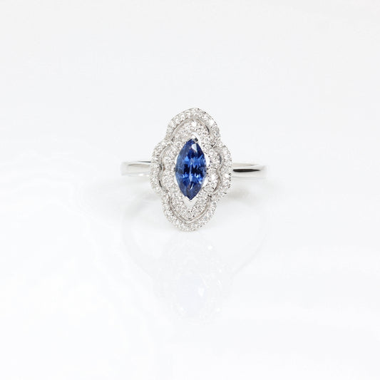 Nature Blue Sapphire Marquise Ring Double Halo in 18k White Gold